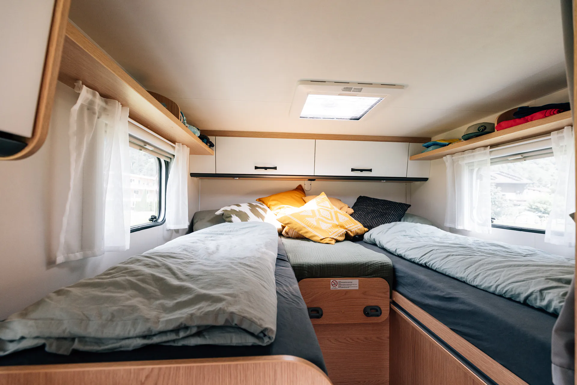 For de som har mye utstyr å oppbevare, men likevel ønsker å være så smidige og fleksible som mulig: V67S. Dette er smale, manøvrerbare bobiler – som kaller VANS – tilbyr god plass både i bodelen og i den separate bakgarasjen. Dette er den første bybobilen med en permanent tredje soveplass – rask å sette opp, lys og romslig.